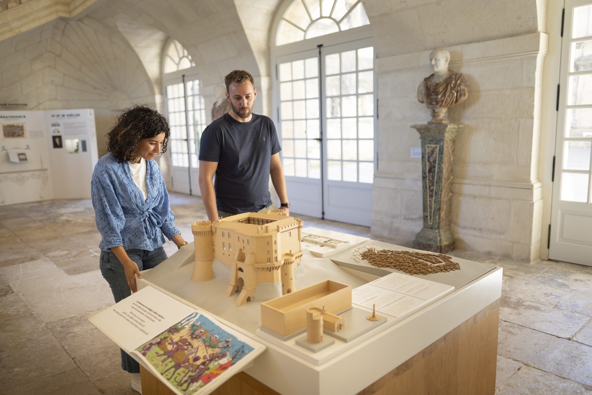 Comprend l’accès à la cour intérieure et au parcours de visite. En salle, différents supports de médiation donnent un premier degré de lecture du lieu et de son histoire (maquettes, fiches de salle, plans, cartels, vidéos).